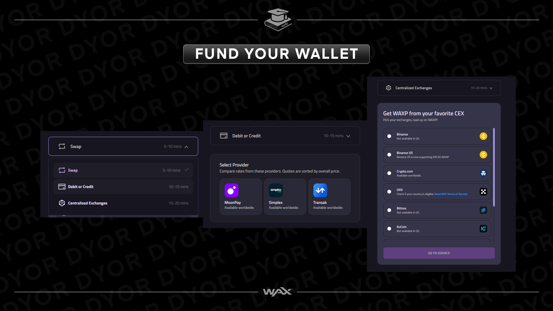 Just choose your provider, enter your payment details, and WAXP will be sent directly to your wallet address (e.g. abcde.c.wam